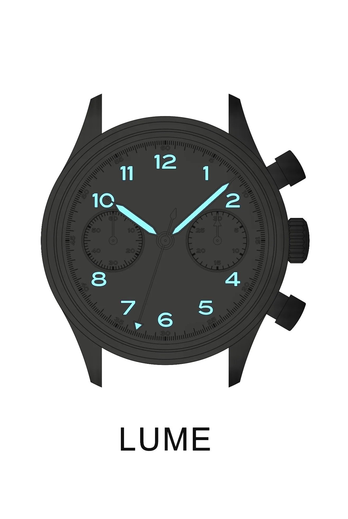 Luminous hour, minute, and chonograph tip hands glow blue in the dark, coated with high grade (A Grade) Swiss BGW9 Super-Luminova