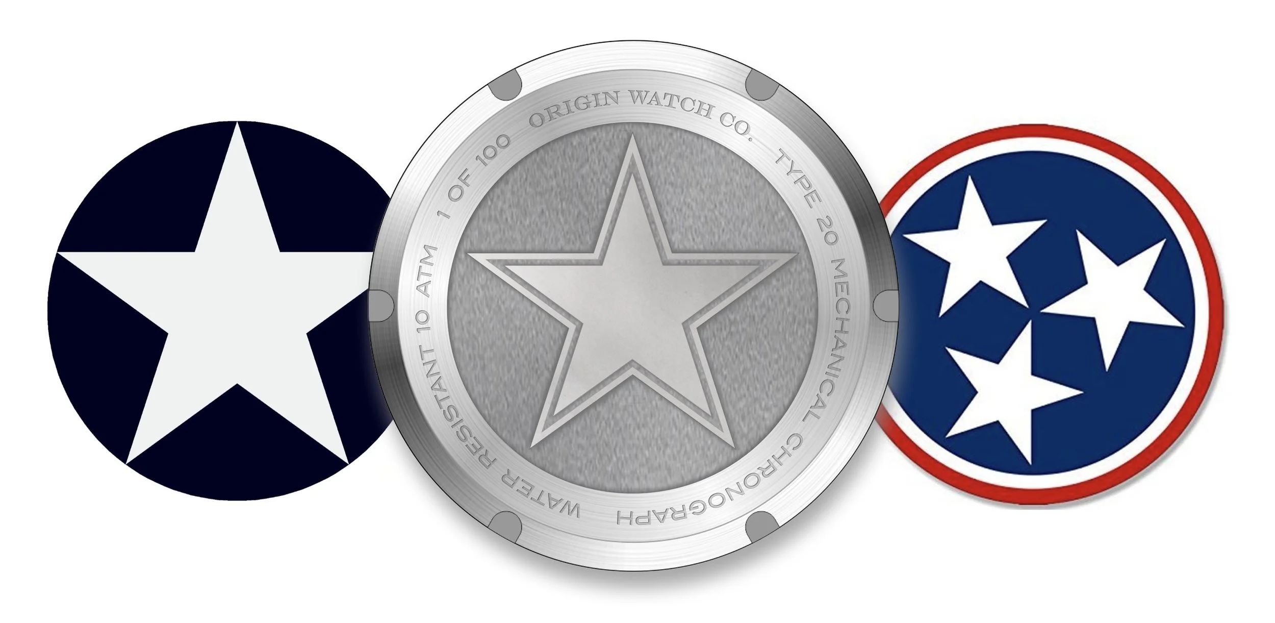 Decorated screw-down caseback with an engraved/embossed 3-star design within a circle, representing vintage and current Air Force insignia and giving a nod to the Tennessee flag; the birth-state of Origin Watch Co. and this timepiece