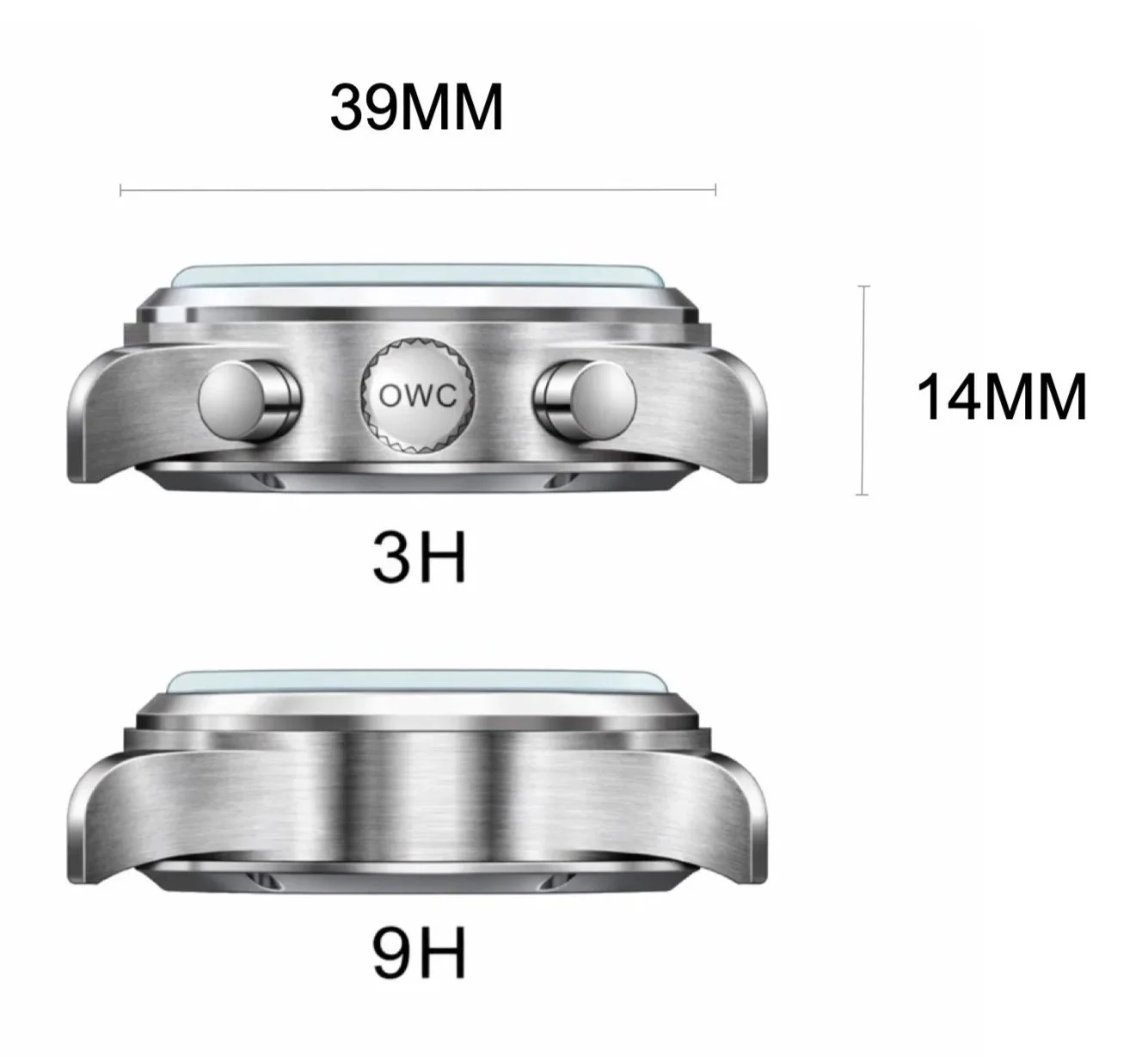 7mm oversized waterproof screw-down crown with OWC logo